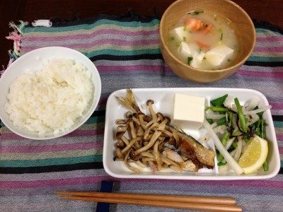 ごはん、トマトとお豆腐のお味噌汁、大根とクレソンの塩昆布和え